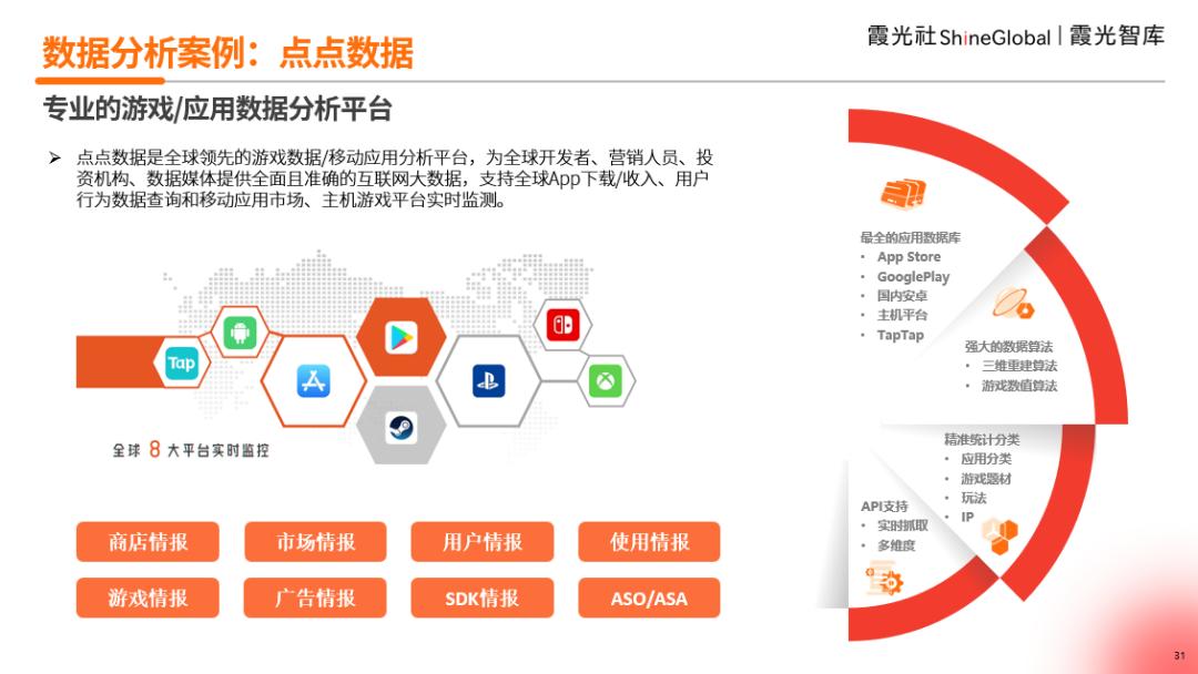 点点数据它是世界领先的游戏数据/移动应用分析平台,为全球开发者、销售人员、投资机构和数据媒体提供全面准确的互联网大数据,支持全球App下载/收益、用户行为数据查询和移动应用市场、主机游戏平台的实时监控。