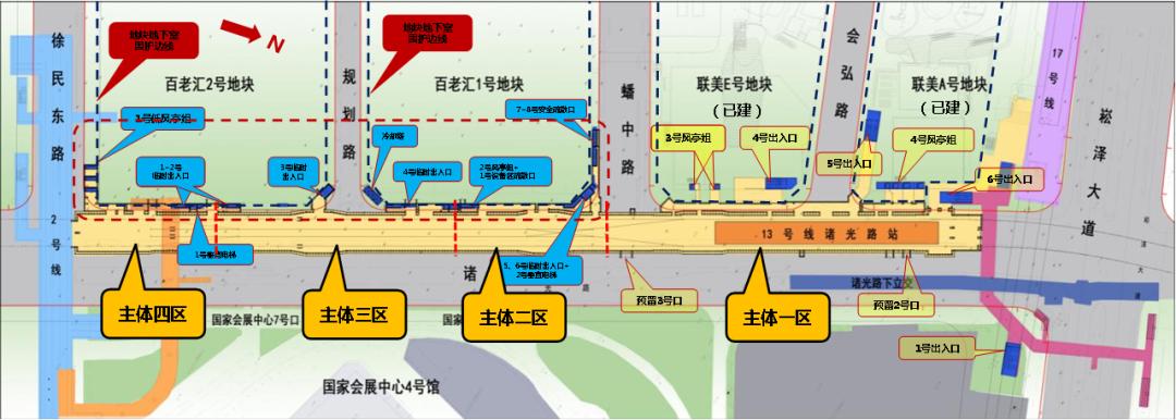 轨交13号线西延伸诸光路站位于虹桥主城副中心的核心区域,位于徐民东路与大道之间,沿诸光路南北方向。该站北端与17号线诸光路站实现通道转移,南端与2号线徐泾东站形成T型节点转移;它是一个地下三层(局部五层)的岛式车站。