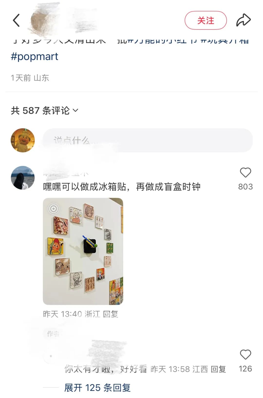 例如一位网友将Labubu收纳进宜家的亚克力相框内,将Labubu围成一个圈,做成画框Labubu,悬挂在家中最显眼的墙壁上。还有一位网友将玩偶收纳改造设计成了家庭软装的一部分,他设计了一面玩偶墙,将所有的玩偶都悬挂在墙上,每天面对着这面“价值不菲”的墙,称每天出门都像在设计“OOTD(每日穿搭)”,思考到底带哪个玩偶出门玩。小红书上,一位叫“阿童木”的玩家,将盲盒的拆盒自制成了冰箱贴,再做成盲盒时钟,赢得了高赞。在社交媒体上,盲盒收纳一直是热度较高的话题,不断催生出新内容。