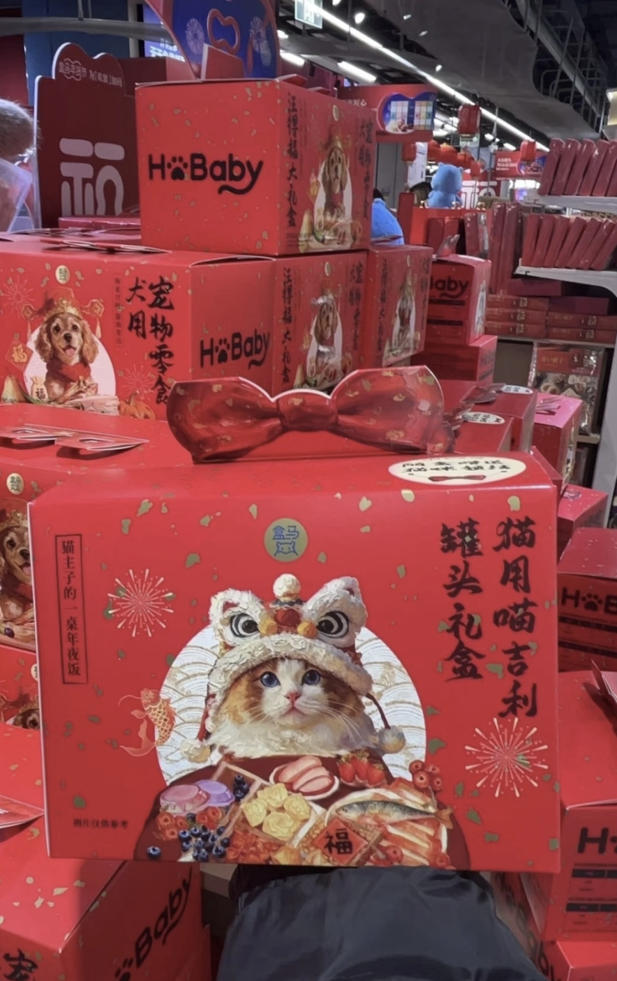在北京世贸天阶和印象城两家盒马鲜生门店,显眼位置整齐陈列着“宠物零食犬用汪得福大礼包”“猫用喵吉利罐头礼盒”以及售价6.8元/盒的“毛孩子冻干压岁包”。世贸天阶店的工作人员告诉记者,这几款产品近期销量火爆,“冻干压岁包是今年新品,往年都没有,很多门店已经卖断货了。”