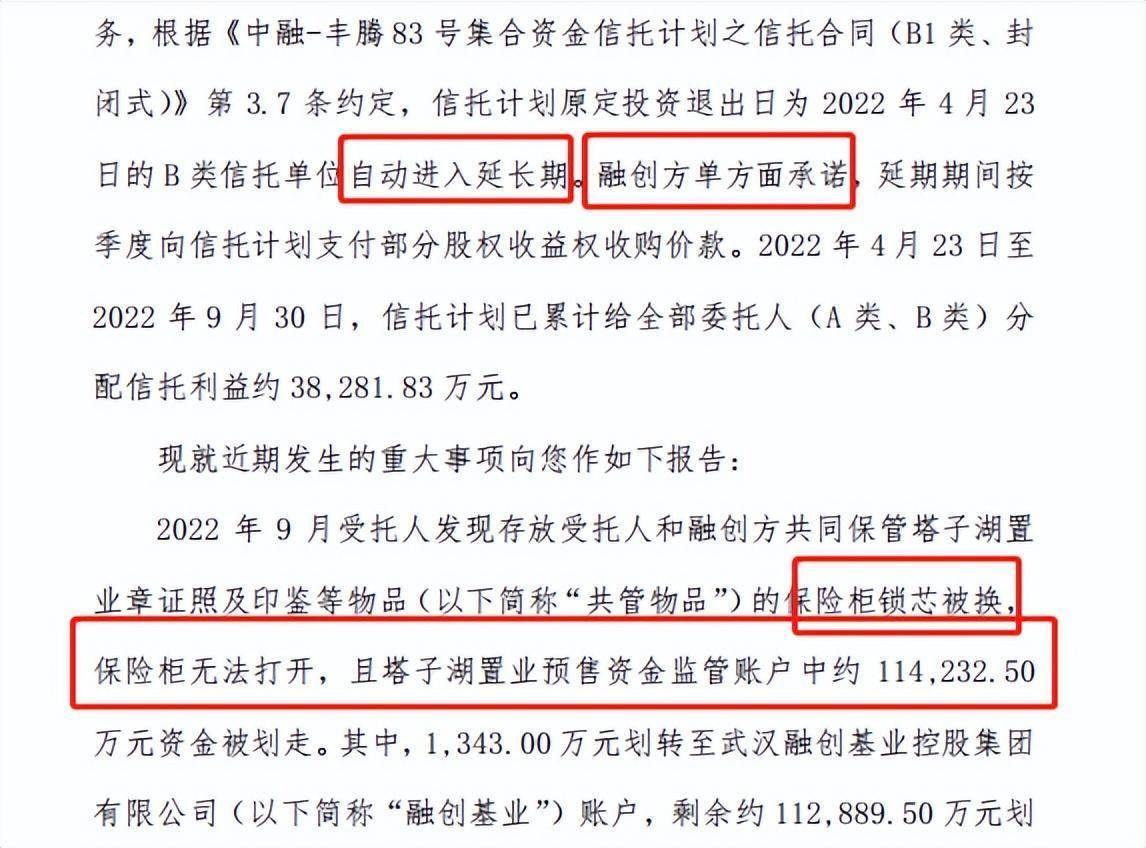 事件发生以后,中融信托在第一时间向公安机关进行了报警,并且采用法律手段查封了塔子湖项目10%的股权和融创公园大观剩余在建未售项目。
