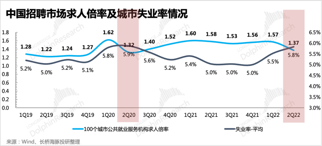 1)一般情况下,在结构性摩擦失业得到显著缓解之前,求人倍率与失业率走势基本同步(如2020年之前),但在2020年二季度和2022年二季度两个疫情封控最严重的时期,出现了走势相反交叉的情况。