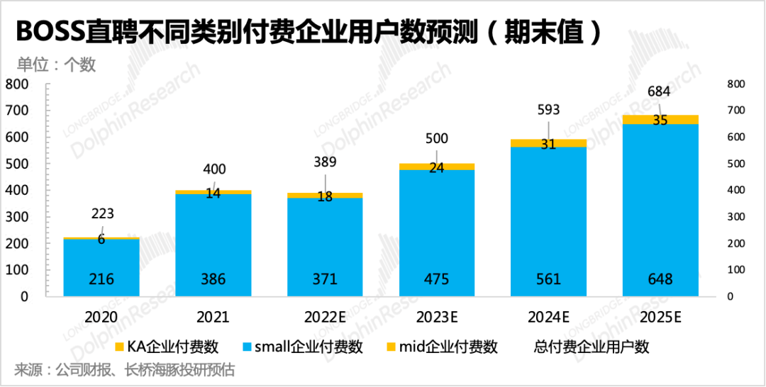 如果按照当前存量的注册用户中企业用户与求职用户的比例1:6(2021年数据),以及按照稳态下近25%的活跃率(2021年数据)、近20%左右的付费转化率(2019~2021平均水平),即: