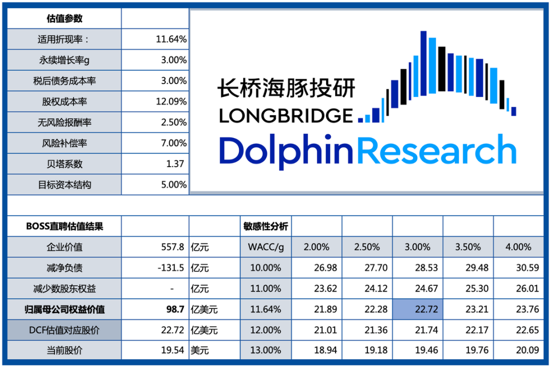 (6)按照WACC=11.64%,g=3%的假设,DCF估值结果为22.7美元/股,对应2024年的净利润,隐含PE 45x。而2023年~2026年净利润CAGR=44.6%,即基本对应PEG=1的假设。