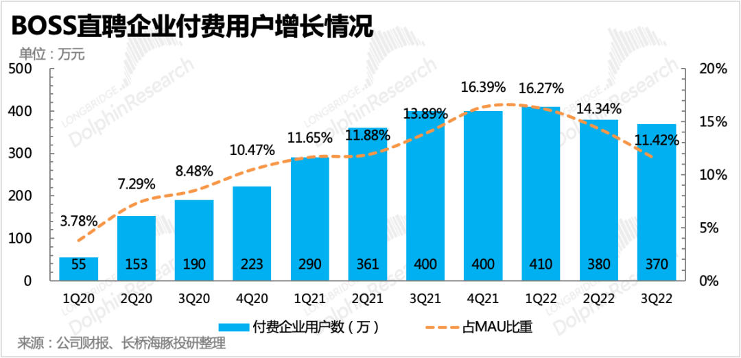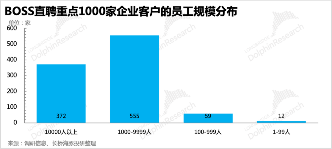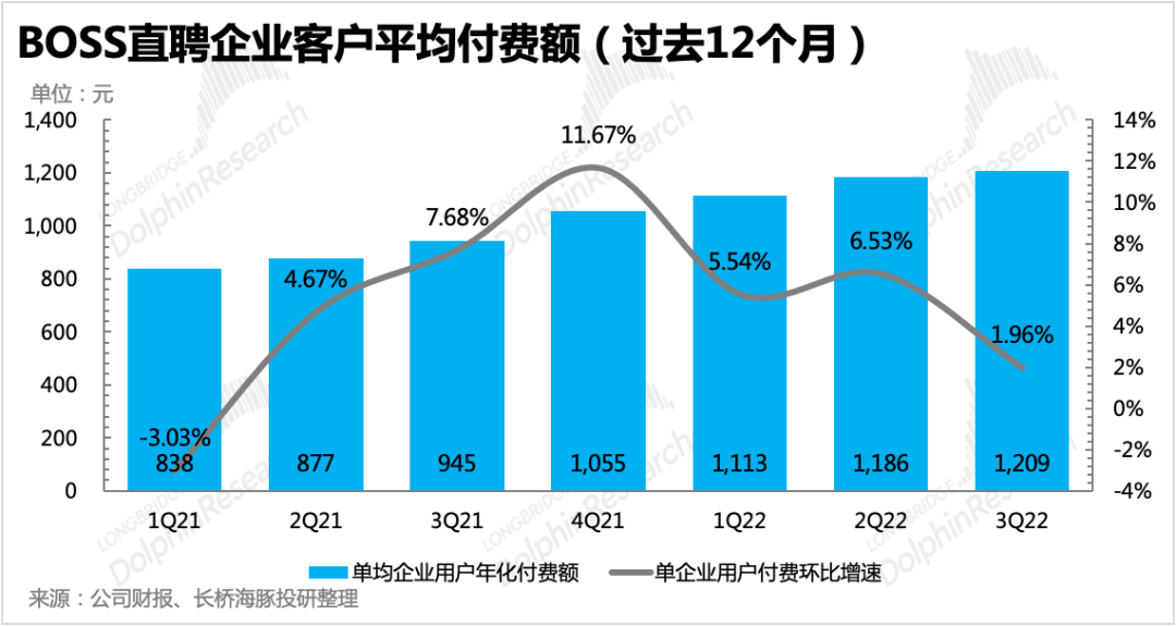 4)而以猎聘为首的传统在线招聘平台,则主要聚焦中大型企业客户,从BOSS直聘与他们的客单价差距就能看出两者客户类型分布的不同。比如上市的猎聘,2022年上半年单个企业用户的付费1.8万元,而BOSS直聘单个企业用户年化付费水平刚到1200元。
