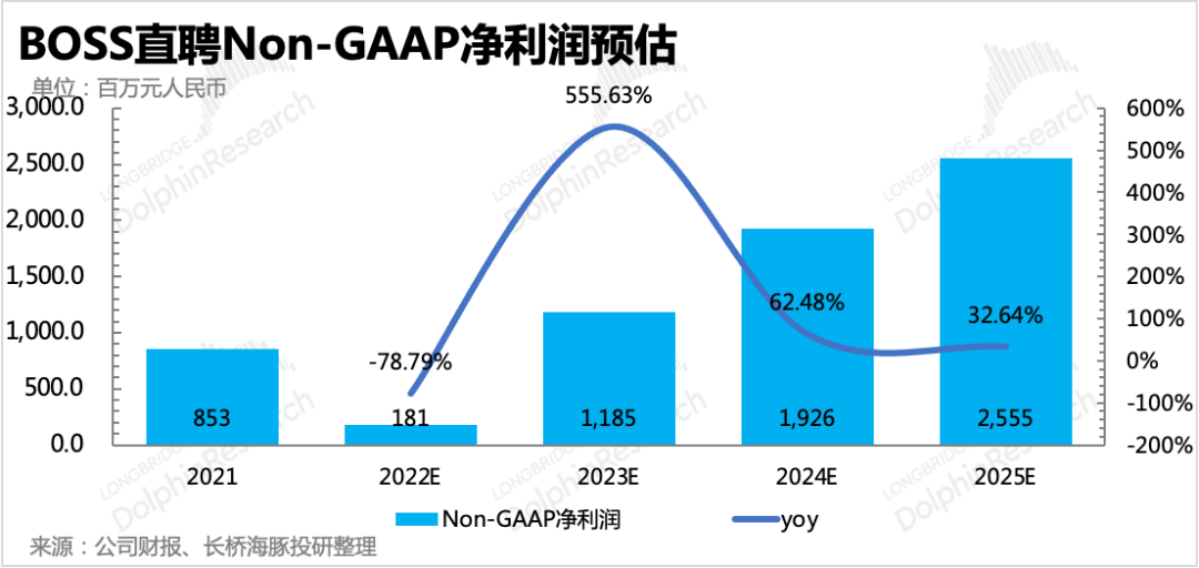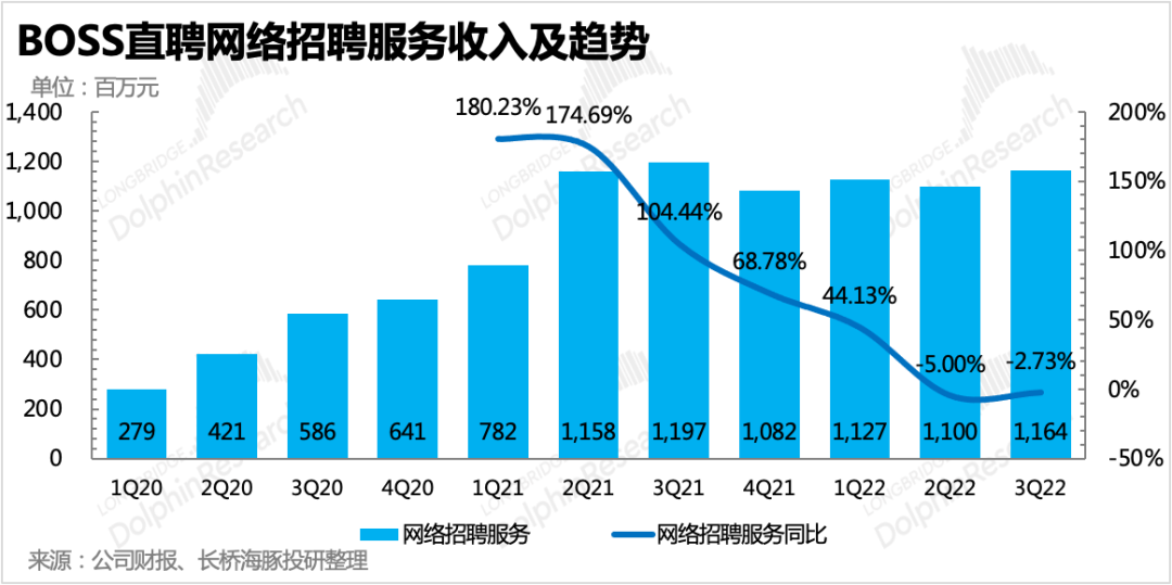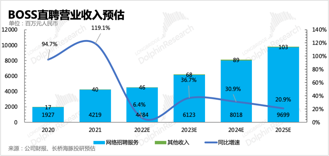 中小企业招聘需求增加+线上化加速渗透+直聊,这三个逻辑都指向了BOSS直聘。虽然线上招聘这个高增长高毛利的赛道又迎来一些新选手涌入,但通过复盘近一年BOSS直聘在监管与宏观“双压”之下的发展情况,海豚君认为 BOSS直聘除了在特定行业(如互联网)、企业类型(中小企业)中对同行存在碾压性优势之外,对于其他细分领域,其算法能力依旧有望复刻经验并产生优势,只是时间长短和用户迁移成本性价比的问题。