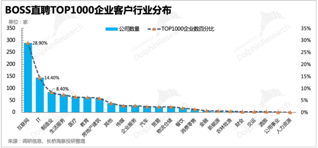 1)互联网企业客户是占比最高的类别,也最容易接受BOSS直聘的模式。但同时在这一波互联网裁员潮,BOSS直聘也受到更多的连累。