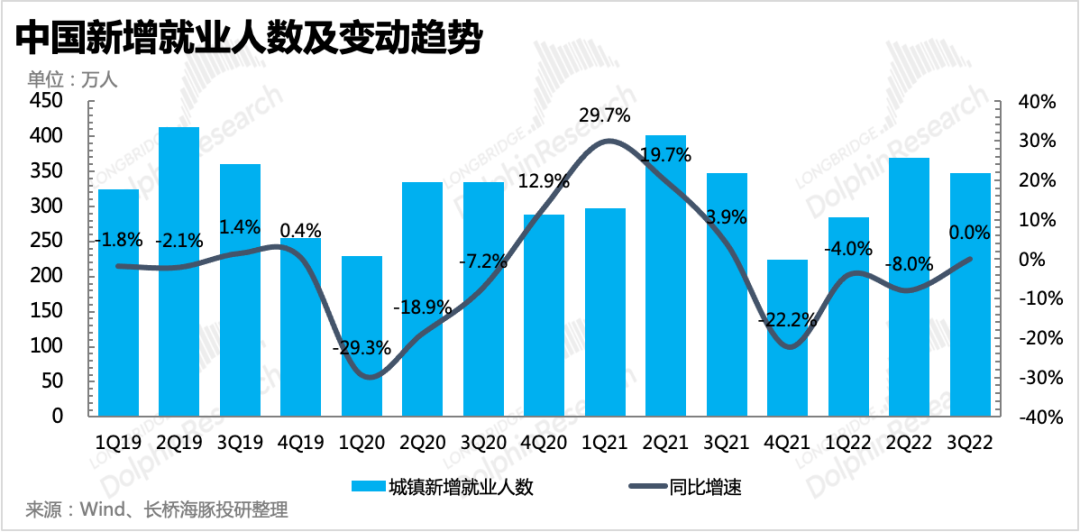 2)再看同期的新增就业人数,这两个时期就业人数均不及疫情前的正常水平(2019年)