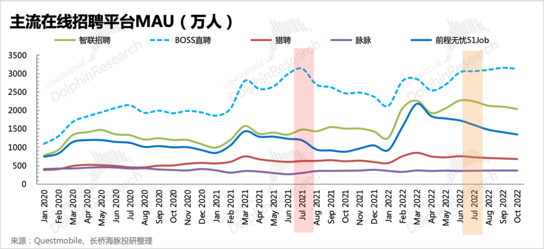 而在今年7月恢复注册后,BOSS直聘的流量扩张开始反击,在三季度同行纷纷环比下行,BOSS直聘净增了600万的活跃用户。11月之后,加上冠名赞助的世界杯开播,BOSS直聘的MAU有望冲到更高的水平。