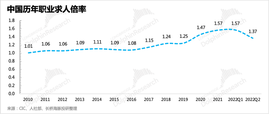 在《BOSS 直聘:招聘行业的终极大 “BOSS”?》中,我们阐述招聘服务市场未来高增长的一个大逻辑:就是自从2010年之后,经济的高速发展(尤其是互联网经济)以及劳动力人口的逐年下滑,使得企业的招聘“需求”大于求职者的“供给”。求人倍率(需求人数/求职人数)越大于1,企业的招聘成本越高,为了找到适合的候选人,企业就越需要借助招聘平台。