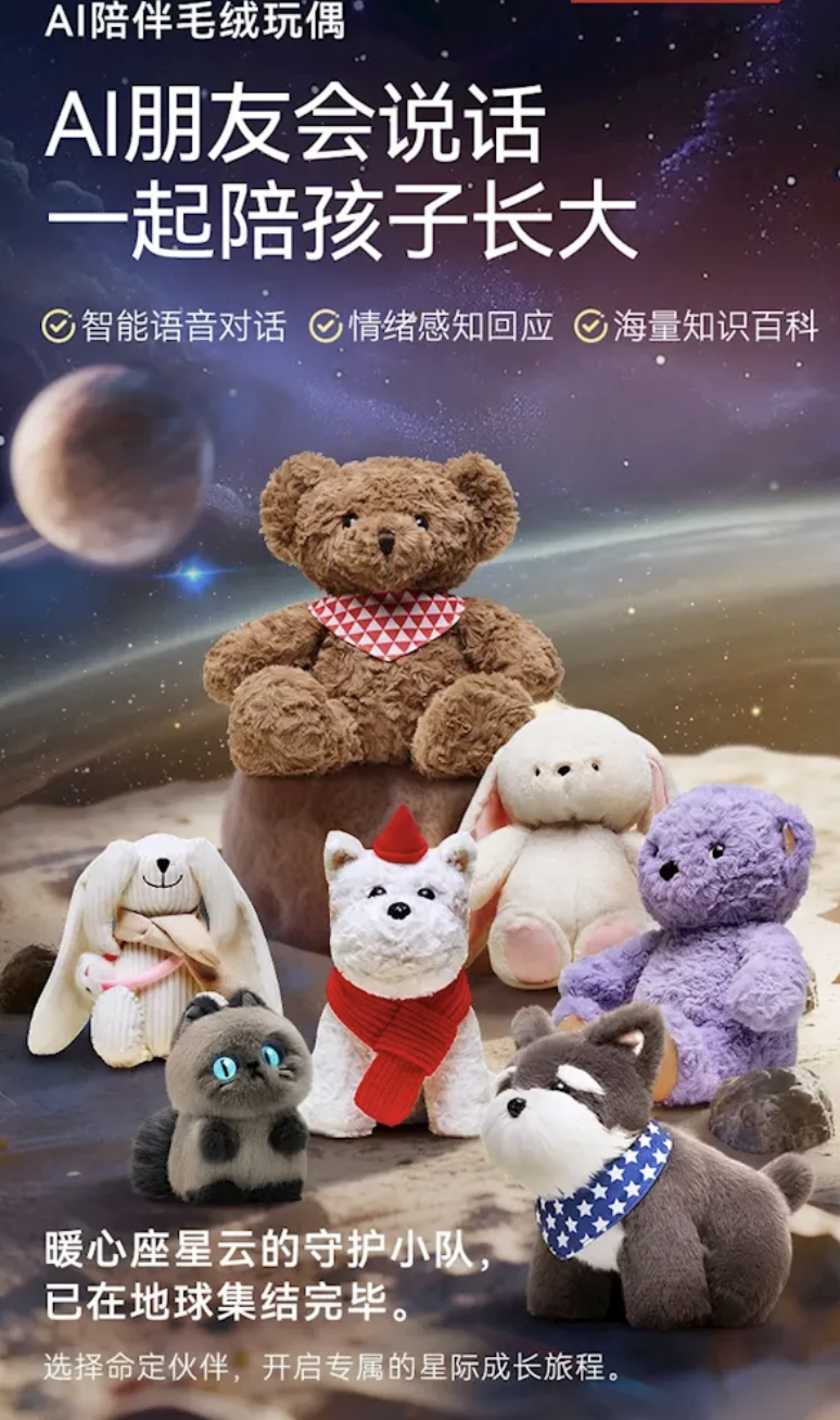 近日,京东京造AI毛绒玩具首批开售,部分款式火速售罄。此次京造共推出了13款AI产品,包括AI毛绒玩具、AI闹钟、AI台灯等。其中,AI毛绒玩具系列产品各具特色人格,如稳重可靠的圆月熊“暖暖”、柔软贴心的云朵兔“茸茸”、善于思考的智星狗“嘟嘟”等。基于京东Joy AI大模型,它们可以为儿童讲故事、教授知识并进行互动沟通,并且具备情绪感知功能,能精准识别孩子的情绪信号,成为孩子愿意倾诉的“小伙伴”。