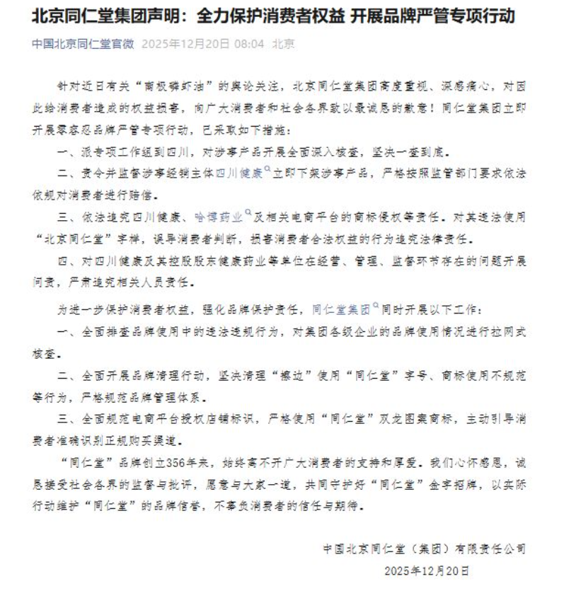 12月20日,中国北京同仁堂(集团)有限责任公司发布致歉声明。声明称,针对近日有关“南极磷虾油”的舆论关注,北京同仁堂集团向广大消费者和社会各界致以最诚恳的歉意,已派专项工作组到四川核查,责令下架涉事产品,对涉事公司和人员严肃追责,立即开展零容忍品牌严管专项行动。此前12月11日,上海市消保委发表文章称,一款标称“北京同仁堂99%高纯南极磷虾油”的产品,在网页上写着“高含量”“智利进口原料”“高度提纯”“1粒≈100只磷虾”,其磷脂标识值为43%,但检测结果显示该款产品磷脂含量为0。