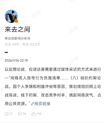 1月16日晚间,贾国龙通过个人微博账号@西贝贾国龙 宣布,“今晚10点,我们将就罗永浩对西贝的重大污蔑诽谤一一全面回应”。21时50分许,@罗永浩的十字路口 以及@西贝贾国龙 两个账号均被禁言。新浪微博首席执行官王高飞 发文称,“以后想论战,应该还是需要通过媒体采访的方式来进行~~‘网络名人账号行为负面清单……(八)组织约架论战。因个人争端和利益冲突等原因,策划或组织网上论战骂战、线下约架,攻击竞争对手,挑起网络戾气,占用公共资源。’”