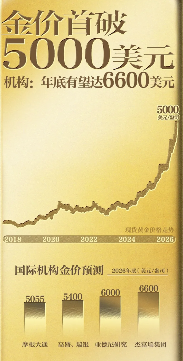 1月26日,现货黄金价格冲高,首次突破5000美元/盎司的关键心理整数关口。对于本轮黄金价格的大幅上涨,业内人士表示:各国央行的战略性资产配置需求是本轮黄金上涨的核心支撑。此外,美联储处在降息周期,意味着持有美元资产的吸引力下降,而黄金作为“无利息资产”的机会成本变低。展望后市,黄金长期上涨趋势获机构普遍看好。华西证券预计,2026年金价涨幅或介于10%—35%区间,杰富瑞集团更是喊出了6600美元/盎司的惊人目标。