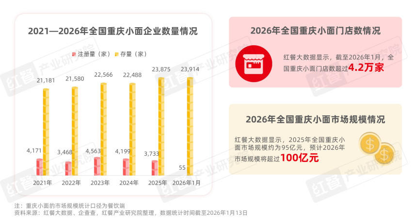 近年来,地方文旅消费持续升温,一些地方特色面食不断被市场挖掘,逐渐从地方走向全国,重庆小面就是其中之一。企查查数据显示,截至2026年1月,全国重庆小面相关企业数量约2.4万家,较2024年年底增长6.3%,预计2026年重庆小面市场规模将突破百亿元。不过,重庆小面在扩张过程中也面临诸多挑战,当前该赛道仍以夫妻店、街边摊为主,连锁化水平和品牌规模化程度整体偏低。