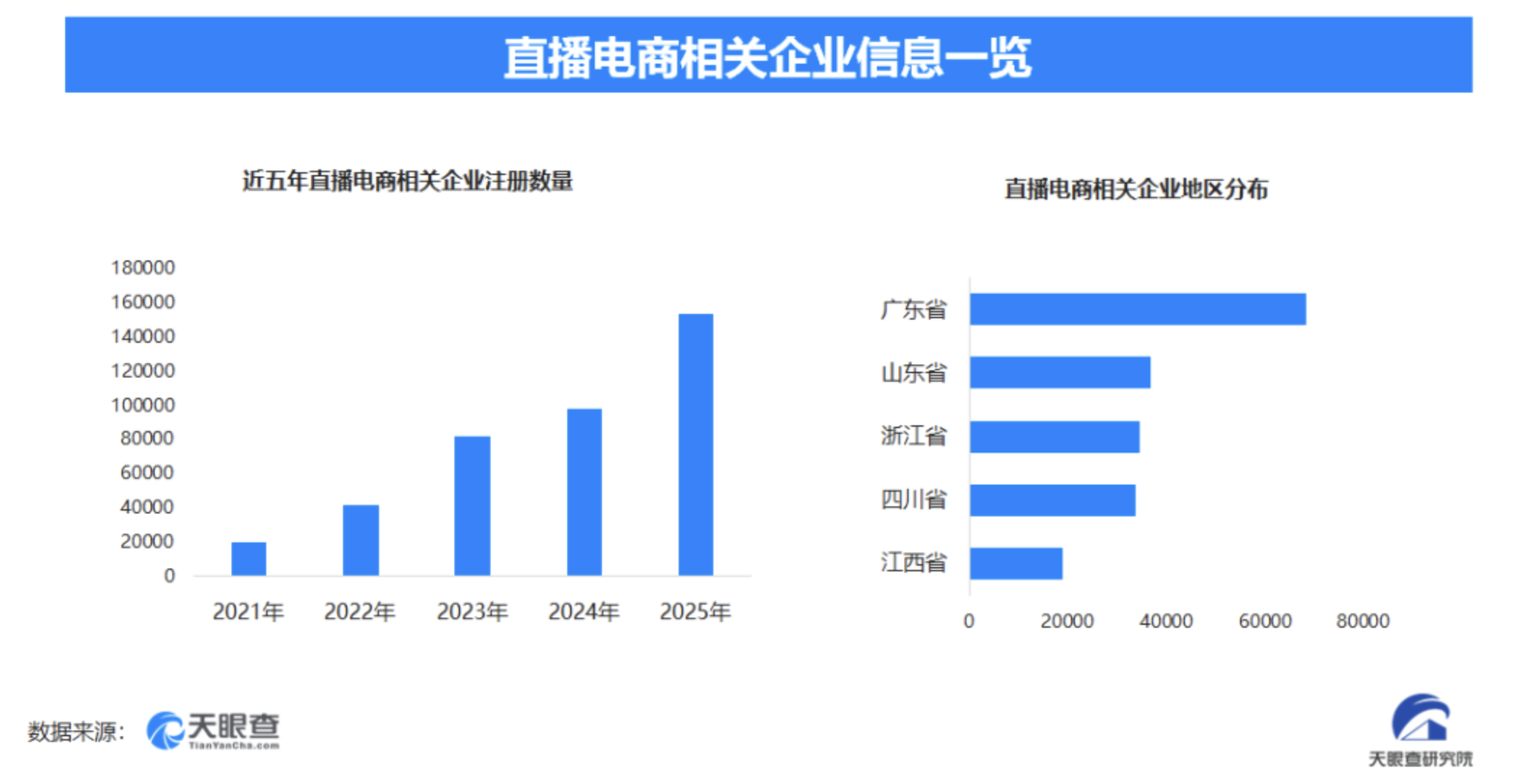 《2025直播电商行业发展白皮书》显示,直播电商已成为消费增长引擎,2019-2024年市场规模增长超12倍,2024年贡献电商增量80%,2025年GMV超5万亿元。截至目前,我国现存在业、存续状态的直播电商相关企业超46.8万家。从区域分布来看,广东省、山东省、浙江省、四川省直播电商相关企业数量位居前列,分别为超6.8万余家、3.6万余家、3.4万余家和3.3万余家。