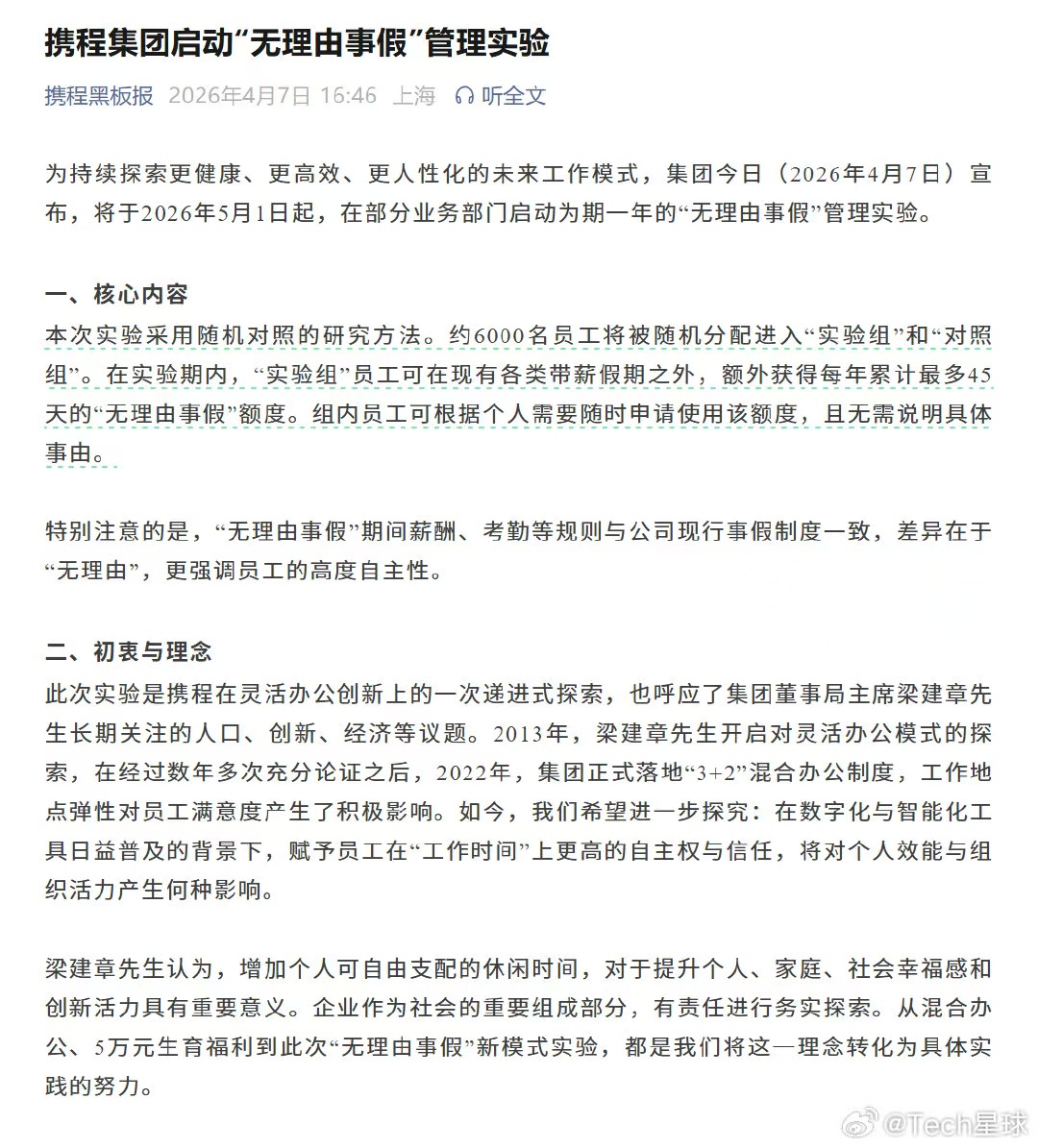 携程集团宣布,将于2026年5月1日起,在部分业务部门启动为期一年的“无理由事假”管理实验。约6000名员工将被随机分配进入“实验组”和“对照组”。实验期内,“实验组”员工可在现有各类带薪假期之外,额外获得每年累计最多45天的“无理由事假”额度。组内员工可根据个人需要随时申请使用该额度,且无需说明具体事由。特别注意的是,“无理由事假”期间薪酬、考勤等规则与公司现行事假制度一致,差异在于“无理由”,更强调员工的高度自主性。