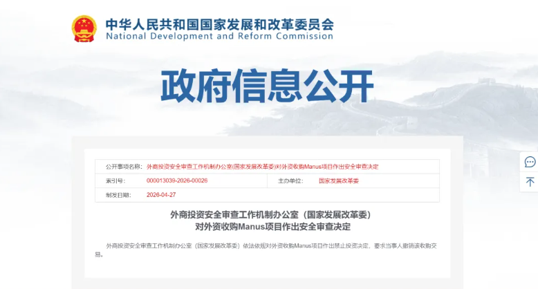 4月27日,国家发展和改革委员会官网公示,外商投资安全审查工作机制办公室(国家发展改革委)依法依规对外资收购Manus项目作出禁止投资决定,要求当事人撤销该收购交易。值得注意的是,该“禁止令”为《外商投资安全审查办法》2020年颁布以来,首次以“禁止投资”为审核结果的,外商针对中国人工智能领域的投资。Manus的核心技术由中国籍团队在境内研发,交易过程中主体架构迁往新加坡,主要人员也在同时向新加坡转移。而从《安审办法》管理范围来看,受审主体除了企业的股权、资产外,投资新建项目也包含在审查范围之内。>>>点击查看详情