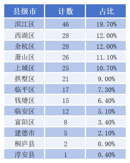 此外,西湖区、余杭区各有28家,占比12.0%;萧山区有26家,占比11.1%上城区有25家,占比10.7%拱墅区有21家,占比9.0%。
