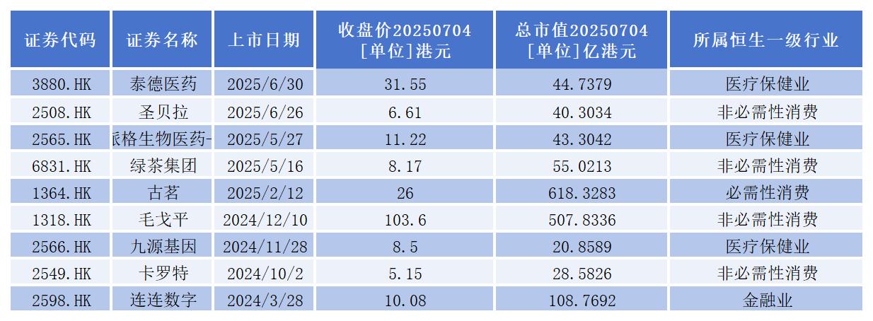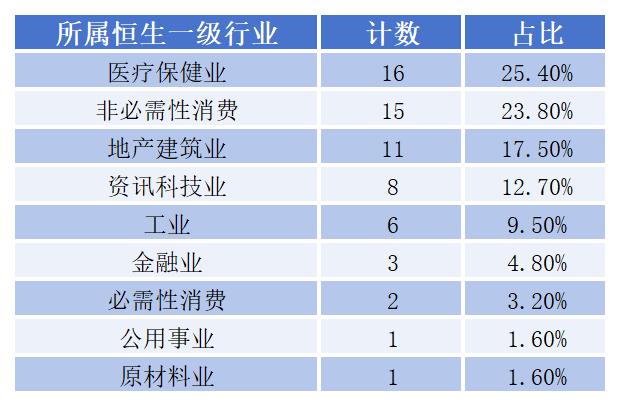 从行业分布看,根据恒生一级行业分类,医疗保健业有16家,占比25.4%;非必需性消费有15家,占比23.8%;地产建筑业有11家,占比17.5%。