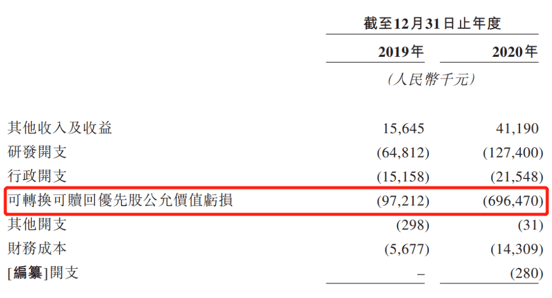 这一项其实并非主业务的运营亏损,而是将IPO融资价格变动计入当期损益。简单来说,投资人在上市之前以一定的价格拿到了公司的优先股,当市场价格超过转换价格,在公司层面表现为负债亏损,但实际上在一定程度上反映了公司自身价值的提升。