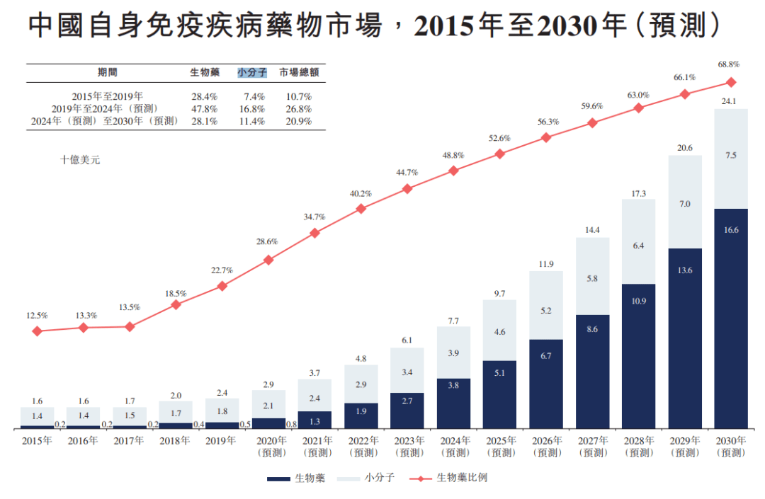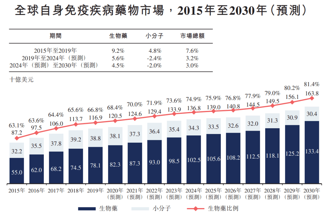 据弗若斯特沙利文,全球自身免疫疾病药物市场预期将由2019年的1169亿美元增加至2030年的1638亿美元。其中,生物药的市场份额预期将由2019年的66.8%增加至2030年的81.4%。中国市场也颇为可观,预期将由2019年的5亿美元增加至2030年的166亿美元,其中生物药的市场份额预期将由2019年的22.7%增加至2030年的68.8%。