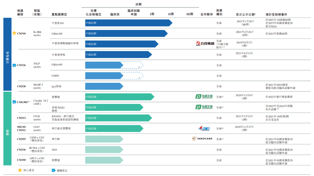 CM326是中国首个、全世界第三个获临床试验申请批准的国产TSLP靶向抗体;CMG901是首个在中国及美国取得临床试验申请的Claudin 18.2抗体偶联药物,有望补足全球胃癌Claudin 18.2靶向药的空白。