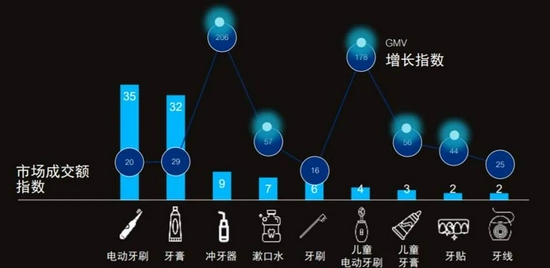根据阿里研究院 2020 年 9 月发布的《2020 年口腔护理行业最新趋势报告》,报告显示,电动牙刷是市场成交额指数最高的细分口腔护理产品;而冲牙器的 GMV 增长指数达到 206,成为该口腔护理产品中增幅最高的品类。