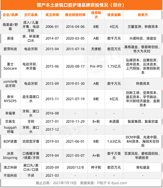 事实上,IT 桔子梳理发现,除参半外,目前已有 BOP 波普、清之科研、茶佳、usmile、贝医生、幸福草 、素士 、不垢科技等新锐口腔护理品牌涌现,并获得资本青睐。除了专业的风险投资机构,连百度风投、字节跳动都参与进来了。
