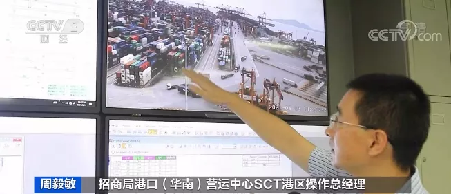 招商局港口(华南)营运中心SCT港区操作总经理 周毅敏:现在可以看到码头非常满,全都是重箱。正常情况码头不可能堆这么高的重箱,一般也就四层左右,现在我们可以看到有六层高的。