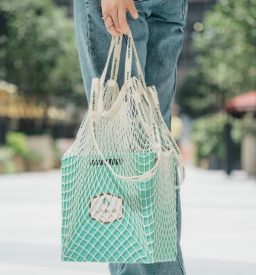 星巴克星悦和星奕两款月饼礼盒附带了由100%再生聚酯(RPET)纤维制成的网兜打包袋,内置弹力带可以用来固定随行杯、瓶装水,也可用于收束网包,便于每日携带。