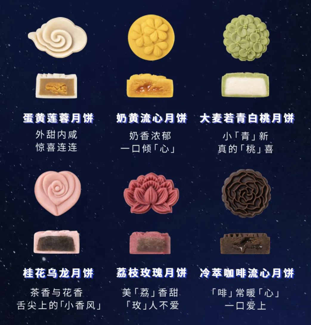 月饼共有六种口味,这六种口味分别被做成了六种图案,其中,蛋黄莲蓉月饼是一朵云的形状、桂花乌龙月饼的形状是一颗心、荔枝玫瑰月饼的形状是一朵荷花。