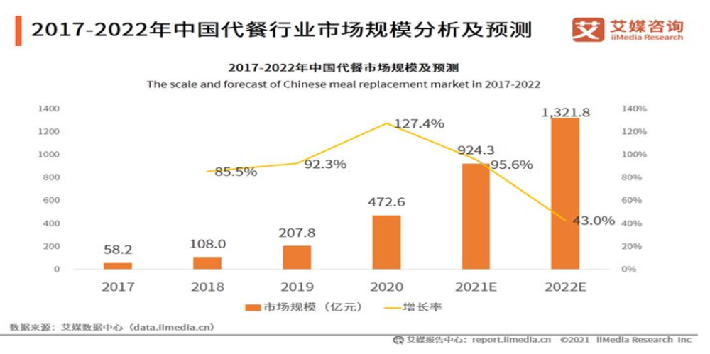 据艾媒报告数据显示,2017-2020年,中国代餐市场爆发式增长,年复合增长率为68.8%,其中2020年市场规模为472.6亿,预计今年市场规模将达924.3亿,增速达95.6%。
