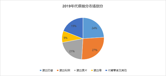同时,据观研报告数据显示,从代餐细分市场结构看,2019年代餐粉占整体市场比重27%;代餐奶昔和代餐麦片占比分别为24%、21%;然后是代餐棒,占比仅为9%。