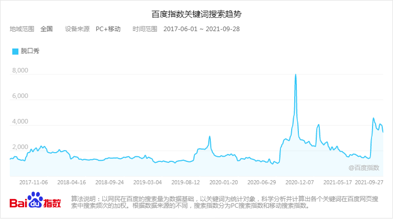 脱口秀行业在经历线上开花线下香的局面。喜剧脱口秀节目《脱口秀大会》每季新节目,都会引发线上的热议。2019年9月23日《脱口秀大会第二季》收官第二天,脱口秀百度指数出现了第一个小高峰。第二个小高峰出现在2020年9月21日~2020年9月27日,《脱口秀大会第三季》收官之时。