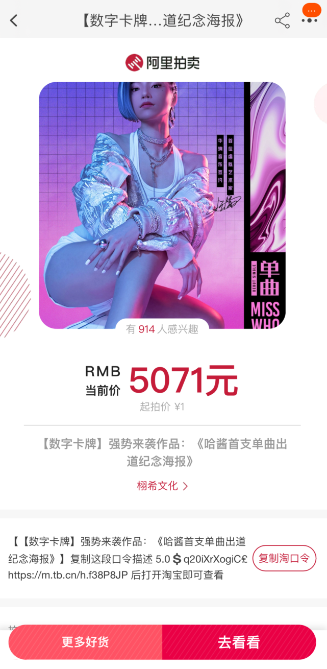 而哈酱是首位与NFT合作的超现实虚拟偶像,并在阿里拍卖上上架了产品。