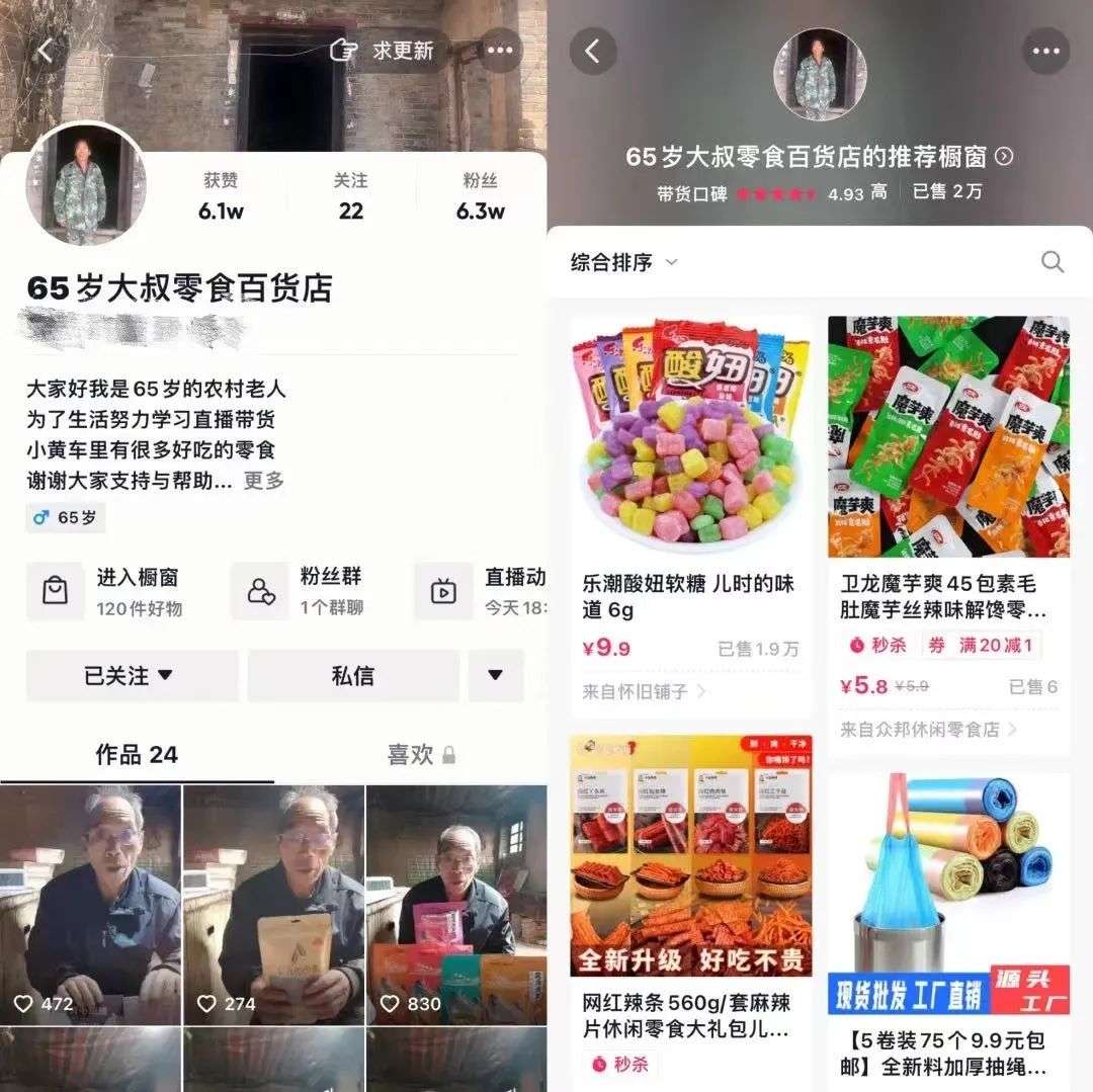 从这些老年主播账号相关联的小店来看,其带货的商品也具有高度的一致性——大多集中在几元到数十元不等,且品类主要为零食,与其展现出的身份相吻合。例如“刘姥姥唱歌”带货客单价最高的商品为一款价值41.9元的泡椒味鸭掌,而“赵老汉百货”带货的也大多都是客单价为9.9元的饼干、点心等等。
