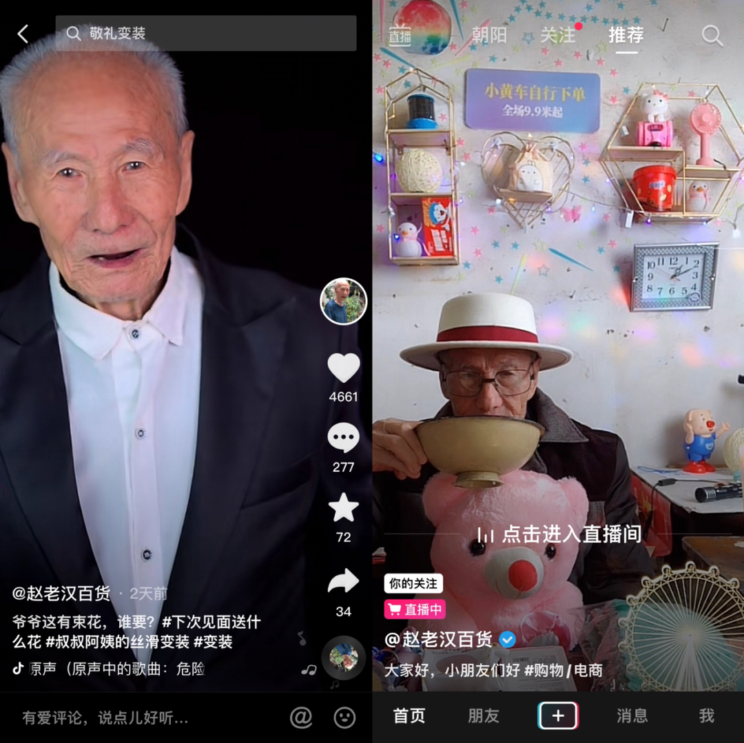 平台的举措也影响了主播的人设包袱。“赵老汉百货”之前所拍摄的视频大多以破破烂烂的房屋为背景,而在近几个月来,其账号所发布的内容中,赵老汉西装革履、精神焕发,无论是灯光还是背景都相对考究,俨然一副时尚爷爷的形象,有了明显的风格转换。