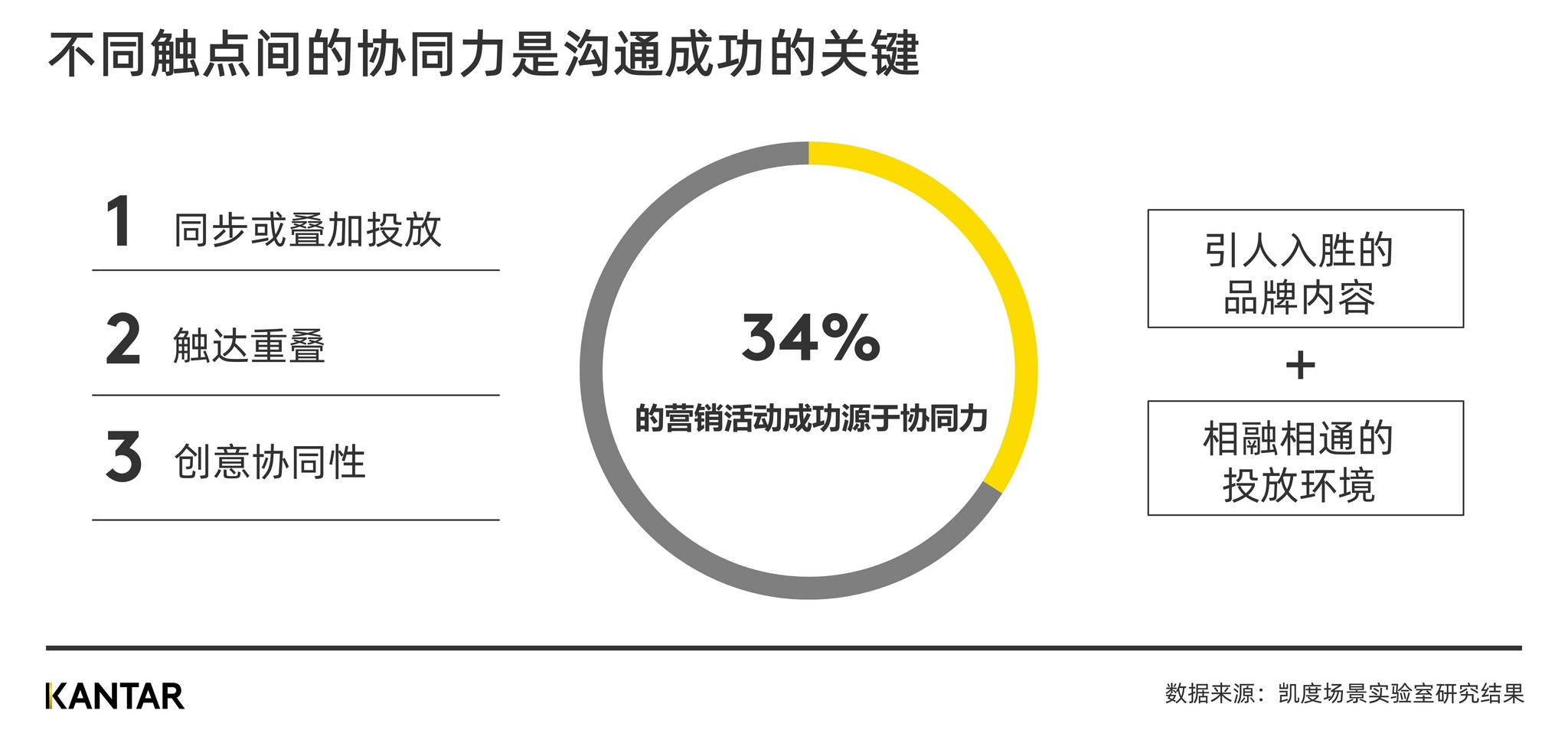 为了扭转这个局面,越来越多的品牌重视营销活动的协同效用。凯度场景实验室(Context Lab)的研究表明,不同媒介触点间的协同力是成功的关键,34%的营销活动成功源于协同力。如果单独使用某些媒介,会使很多消费者无感。