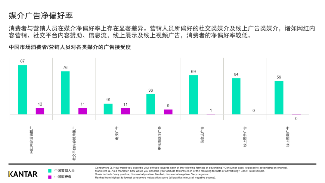 *净偏好率的定义:本次调研中,营销人员和消费者都被邀请对各个媒介上的广告给出评介,分别是“非常积极”、“有些积极”、“无立场”、“有些消极”和“非常消极”。净偏好率即选择“非常积极”和“有些积极”的人群比例减去选择“非常消极”和“有些消极”人群比例后所得到的差额。