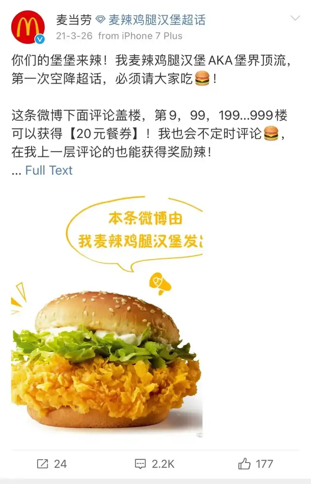 不光如此,麦辣自身的粉丝力量也不容小觑。去年麦当劳就给辣堡开了超话,辣堡空降超话盖楼,2小时不到盖楼2000层。