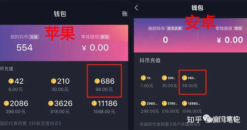 以前一直听很多人讲,用苹果手机会抽成30%,但却不懂什么意思,直到今天才明白原来是这个现象。昨天和小姐妹看美妆直播,激动时刻要给小姐姐送礼物,在充值的时候发现我的安卓系统,充1块钱是10个抖币(比例1:10),而她的iPhone手机,同一个账号,1块钱7个抖币(比例1:7)。