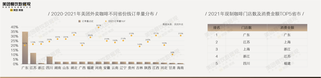 2021年美团线上现制咖啡消费金额、订单量、门店数排名均靠前的省份为:广东、浙江、江苏,和新茶饮的优势市场大体重合。