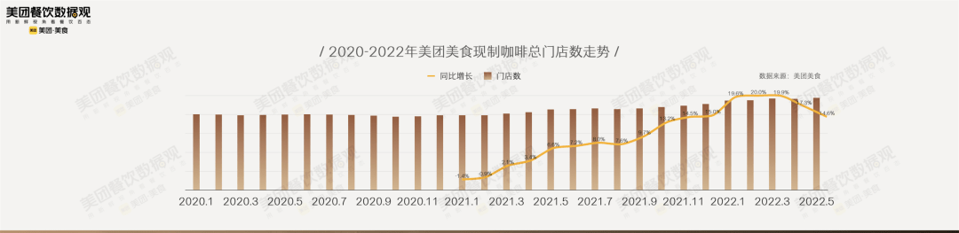 成都2021年门店数同比增长8.2%,到了2022年门店数增长达18.2%,趋近于现制咖啡整体大盘门店增长比例。