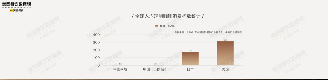 《报告》显示,2021年,中国内地年人均消费现制咖啡1.6杯,一二线城市年人均消费现制咖啡3.8杯。