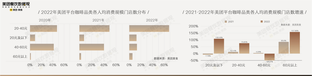 受疫情影响,以及咖啡日常化,全国40~60元价格段门店数有所回落,降幅接近60%。