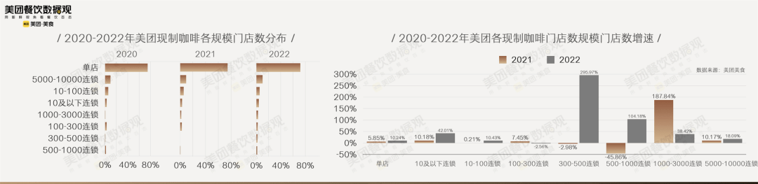 其中,2022年,美团线上300~500家连锁咖啡馆的门店数大幅增长,增速近300%,中型连锁咖啡品牌发展迅速。