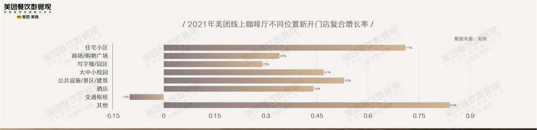 美团数据显示,2021年咖啡馆在住宅小区的新开门店年复合增长率达71%,有向住宅小区及大中小校园聚集发展的趋势,且倾向于开小店,满足用户日常咖啡需求。