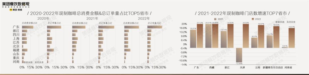 2020年~2022年,连续3年,广东现制咖啡到店消费订单量都位列全国No.1,2022年,广东现制咖啡到店消费订单量占总订单量28.48%,优势明显。