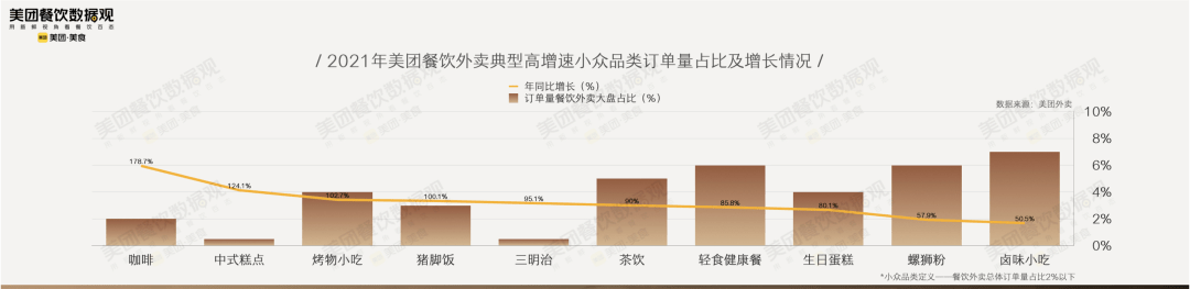 《报告》数据显示,2021年美团外卖的小众品类订单量中,其中咖啡品类订单量同比增长178.7%,远超茶饮、中式糕点、螺蛳粉、卤味小吃等品类。